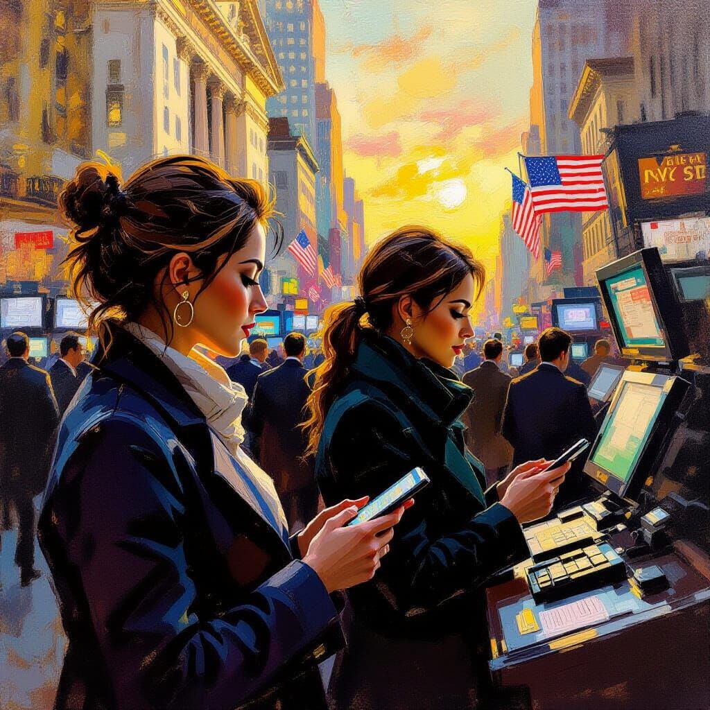 This image shows women traders operating cell phones at the NYSE during golden hour. Rendered in a textured, thick-brushed impressionist oil painting style, evoking energy and high tension.