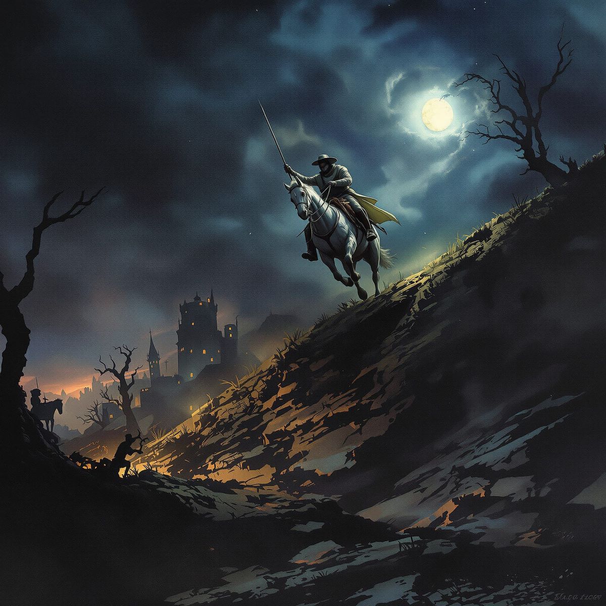 This watercolor image depicts Paul Revere on horseback ascending a hill at night, featuring a blend of dark, occult, and mystical elements with soft, dynamic lighting.