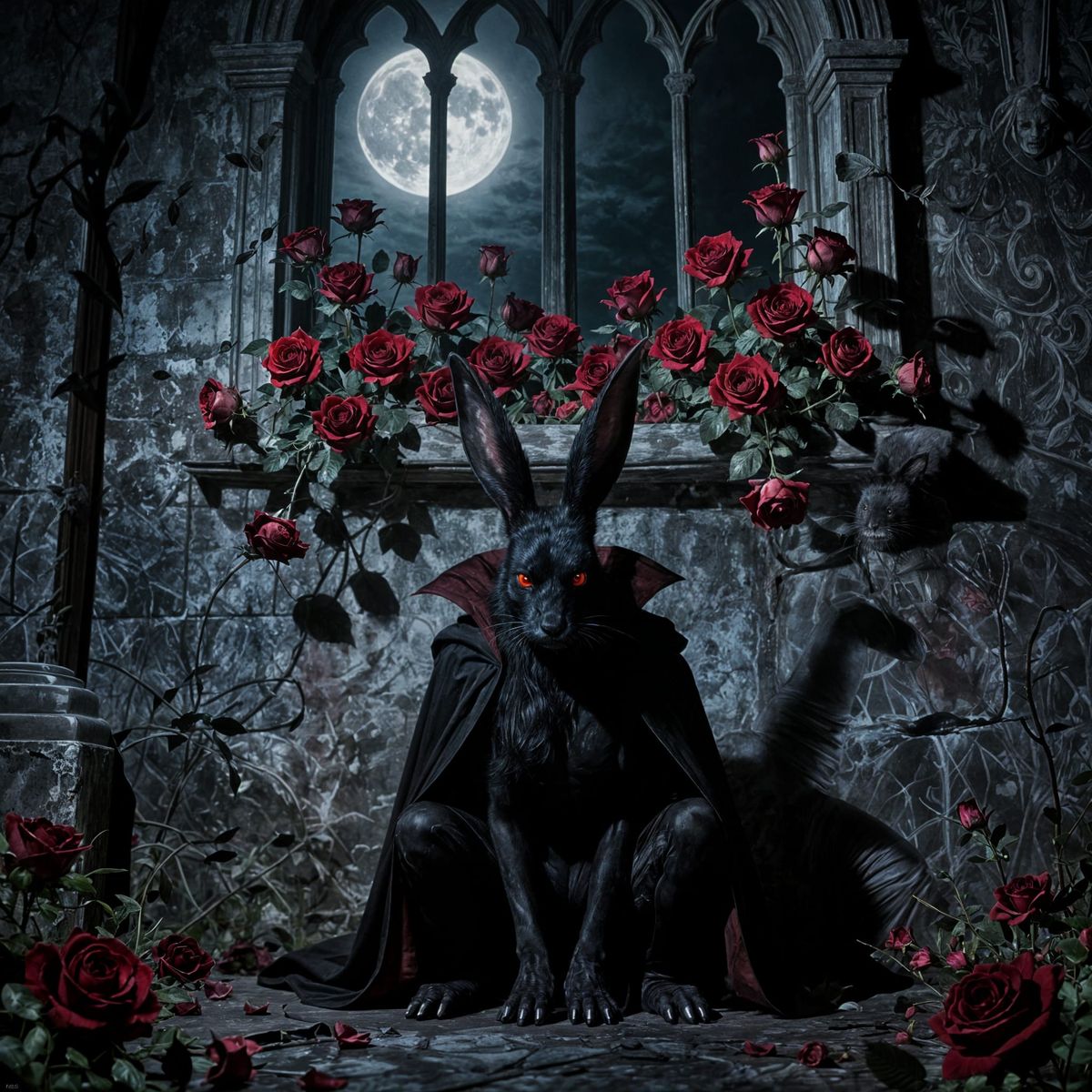 This image depicts a black rabbit with glowing eyes, lurking near a rose-lined window in a scene of surreal dread and dark fantasy. It features harsh moonlight and deep shadows, creating a nightmarish horror atmosphere.