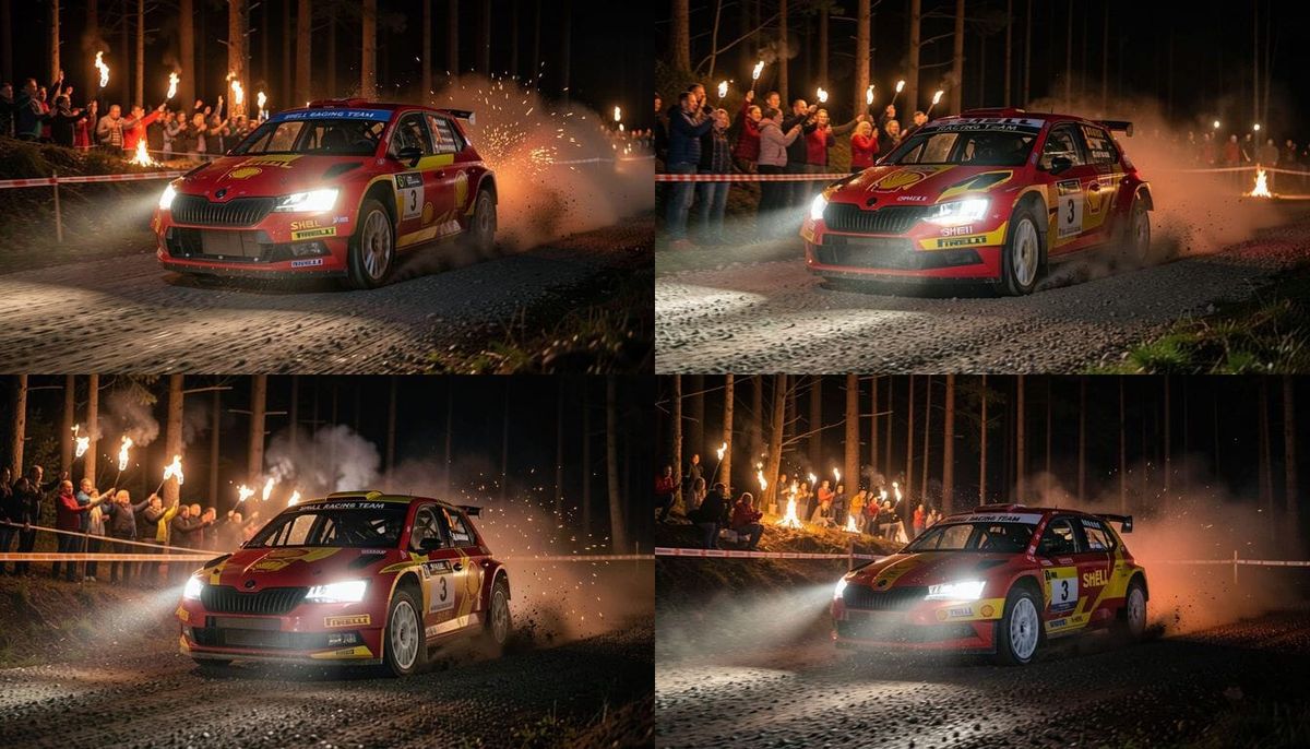This image captures a Skoda Fabia Rally2 rally car in dynamic action at night on a forest stage. Headlights pierce the darkness as gravel flies, with a cheering crowd visible.