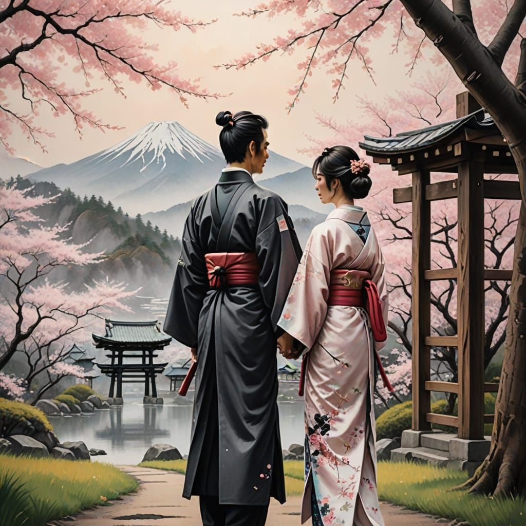 A digital painting of a Japanese couple in traditional clothing beneath a cherry blossom tree. Soft pastels and natural tones create a romantic and serene scene with falling sakura petals. A torii gate stands in the misty distance.