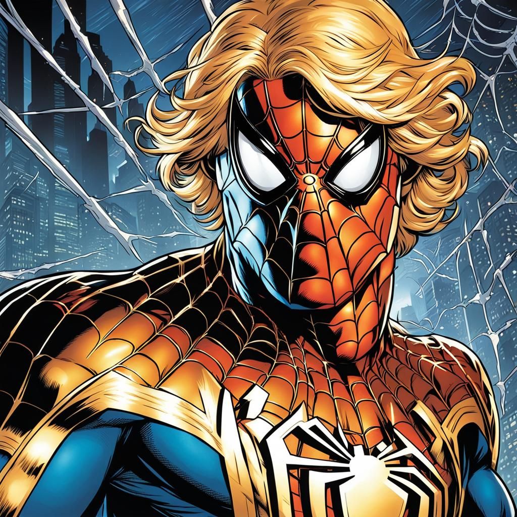 This image shows Spider-Man reimagined with golden hair and eyes, rendered in a comic book art style. The artwork features smooth lines and a vibrant color palette.