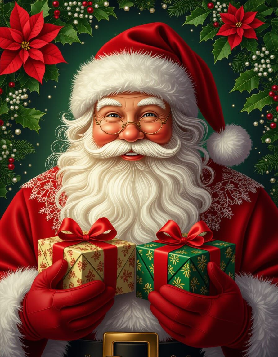 This image showcases a vintage Father Christmas figure laden with gifts, surrounded by traditional Christmas flora and decorative elements like lace and pearls, rendered in a detailed matte painting style.
