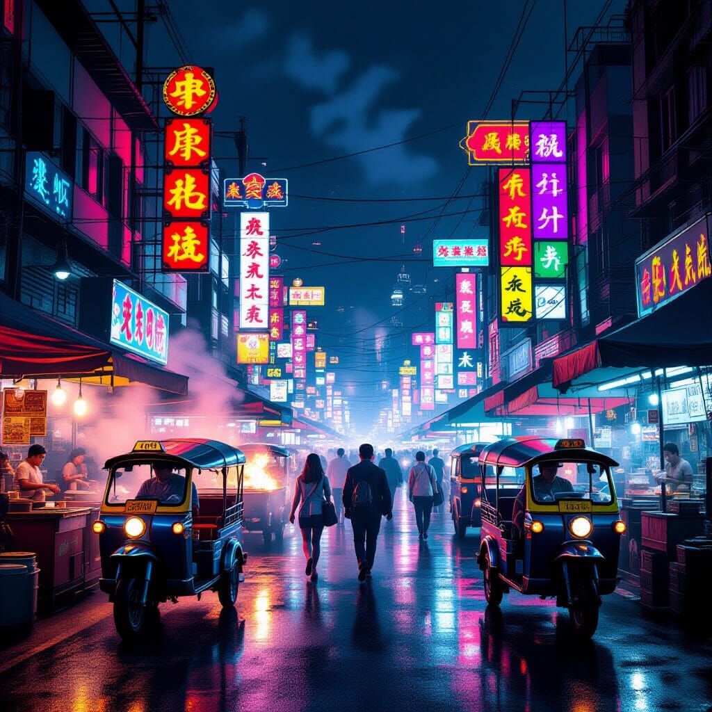 This image shows a vibrant Bangkok night market filled with neon signs and street vendors. The scene has a cyberpunk aesthetic reminiscent of Blade Runner with rich textures.