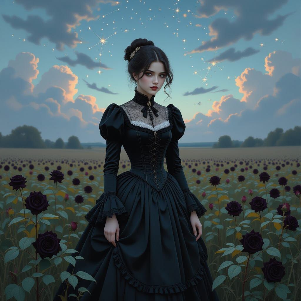 This image features a solitary woman in a tattered Victorian gown among wilting black roses, beneath a celestial sky. It evokes deep solitude and melancholic beauty with painterly, hyperrealistic details.