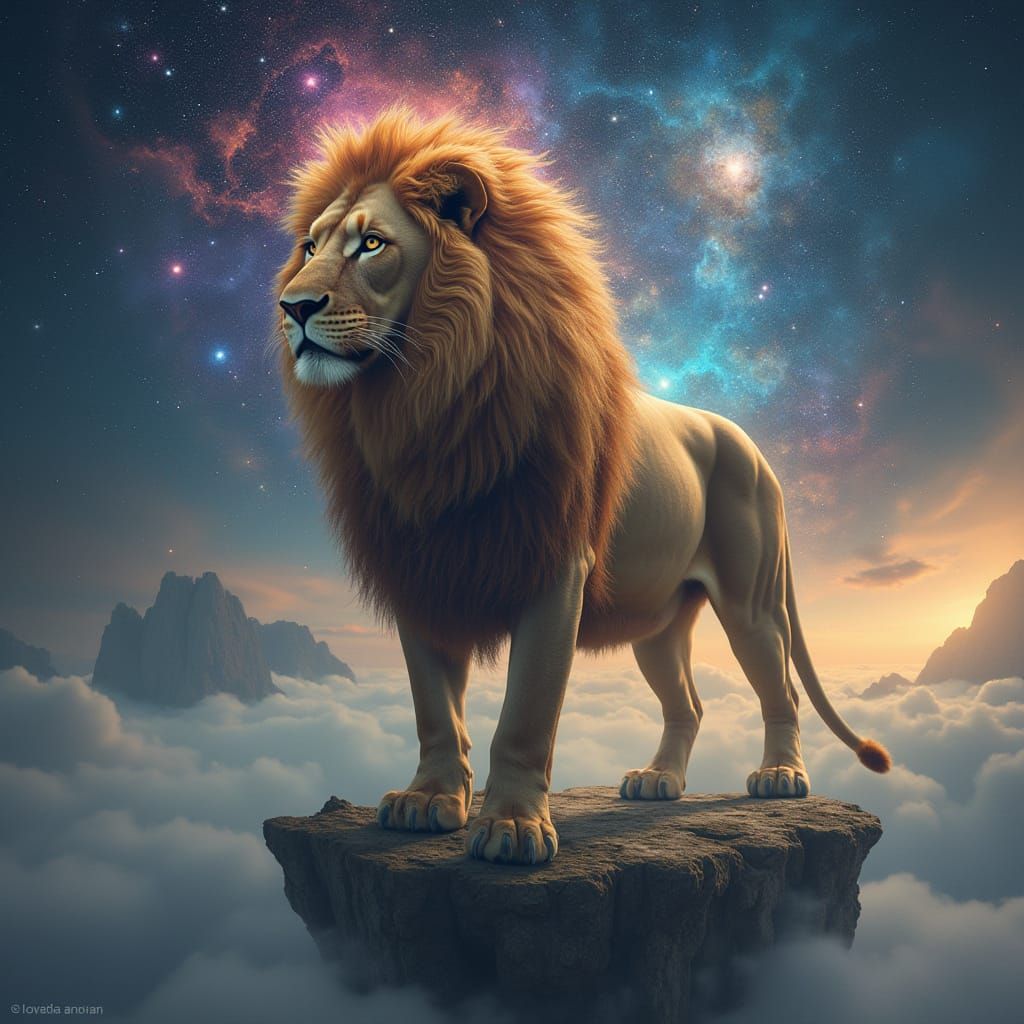 A striking picture of a lion with a galactic mane, standing on a floating island. The image is bathed in ethereal light with swirling nebulae, in a surrealist style reminiscent of space opera concept art.