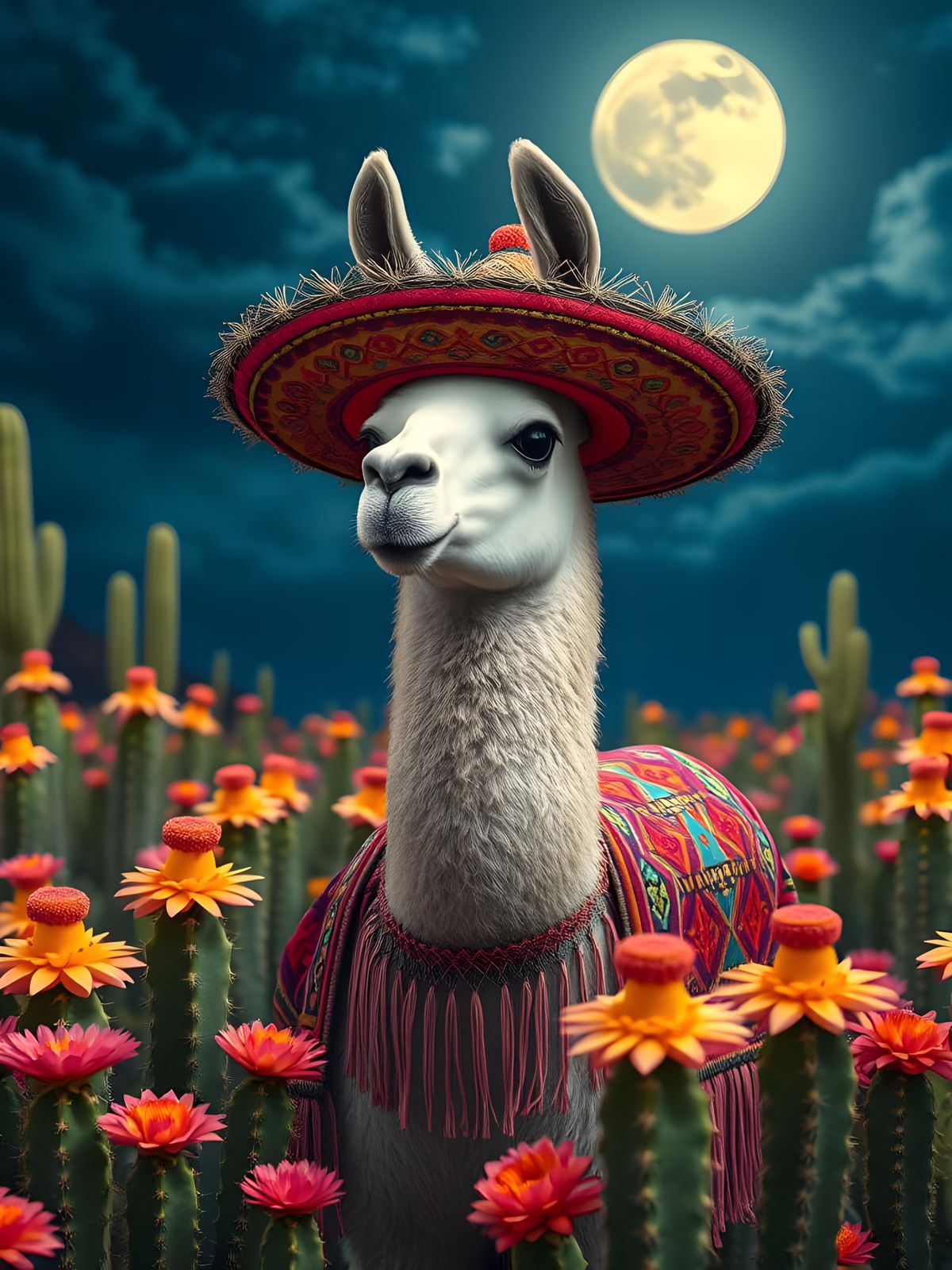 A vibrant image of a llama wearing a colorful sombrero and blanket. The llama stands in a field of blooming cacti against a nighttime fairytale background in a hyperrealistic whimsigoth aesthetic.