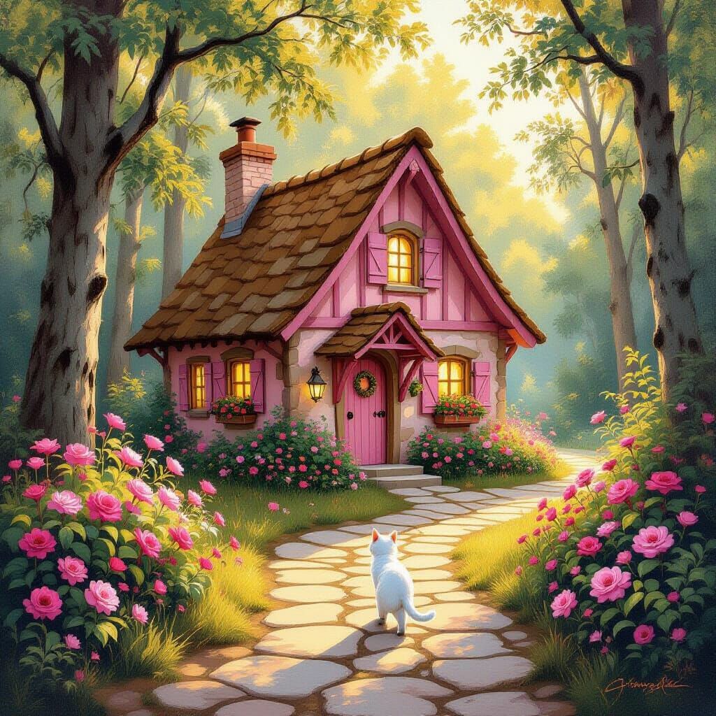 A charming oil painting of a magical pink cottage nestled in a lush forest. A beige stone path leads to the cottage, adorned with pink flowers and a white cat in warm, golden light.