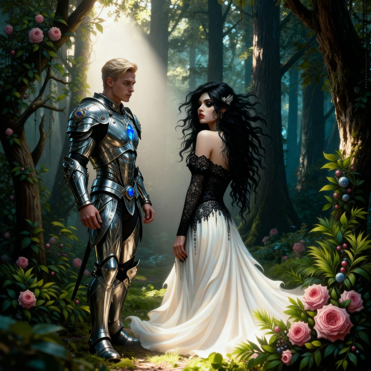 This image depicts Prince Charming encountering Snow White within a magical forest setting, enhanced by dramatic volumetric lighting.