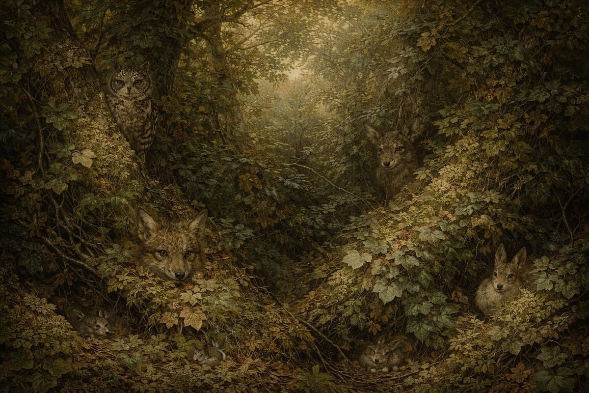 A woodland scene of trees and shrubs, in which the shapes and features of small woodland creatures are merely implied, by using only slight variations of texture, shade and colour in the background. The outlines of the creatures must meld seamlessly with the rest of the scenery. The creatures should ...