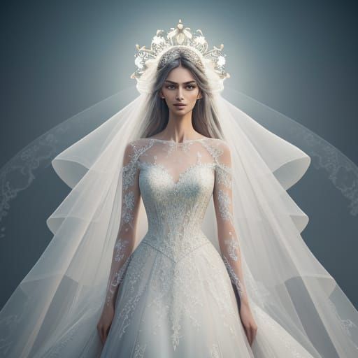 This digital painting features a supermodel in an ethereal wedding gown with intricate lace details. The image uses vibrant colors and dynamic lighting for a masterpiece quality.
