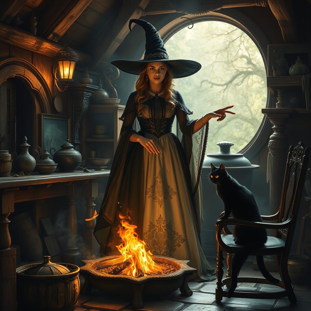 A mystical scene of a beautiful witch surrounded by flowing curtains, a steaming cauldron, and shelves of rare herbs and magical potions, with a curious black cat and a raven watching from a worn wooden chair, evoking the atmosphere of a romantic, old-master painting