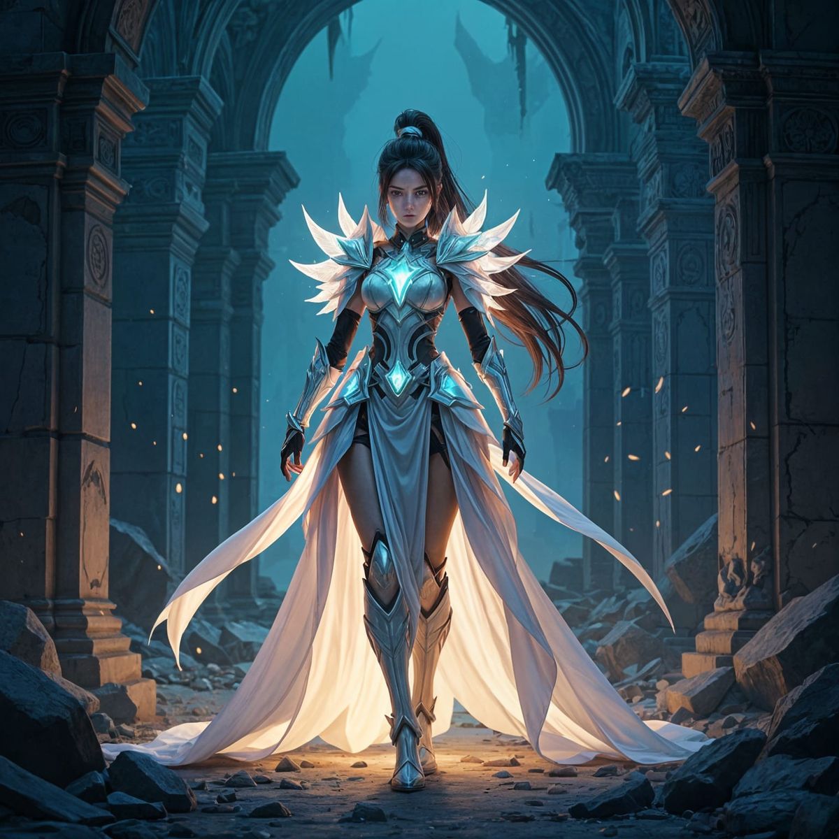 This image depicts an anime-style warrior princess in a desolate temple. Her dress, made of luminous glass, illuminates the ancient ruins with an ethereal glow, creating a dark fantasy atmosphere.