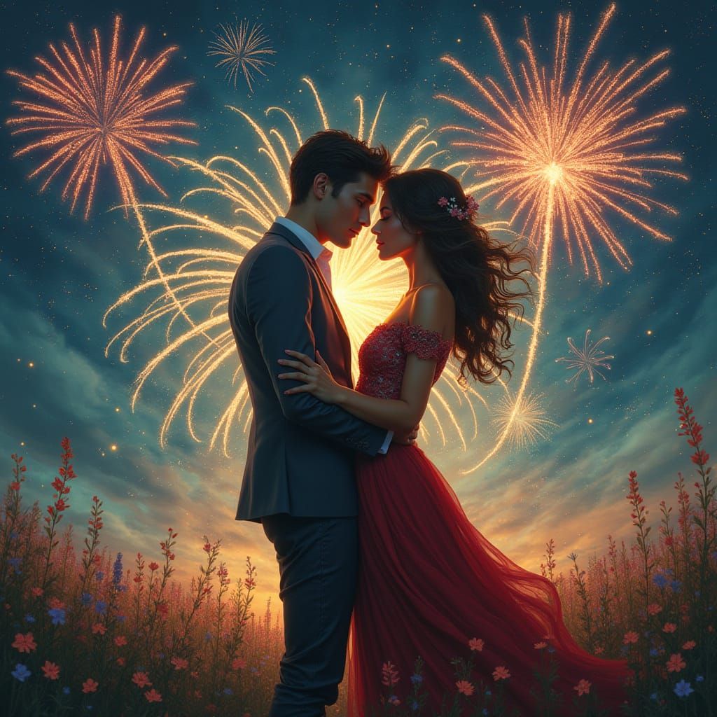 This image shows two lovers in a fantasy embrace as colorful fireworks burst around them. The artwork has a whimsical style, reminiscent of modern fantasy illustration.