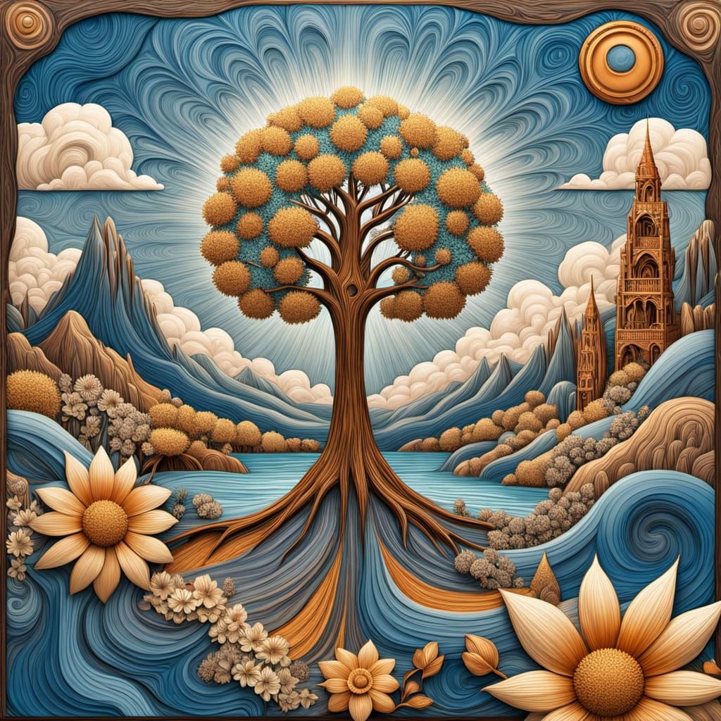 This image shows a surreal summer landscape with intricately detailed, elegant wildflowers and grasses growing on a tree bark board with metallic veins, set against a dramatic, stormy environment with impasto, textured, and zentangle patterns, evoking the styles of Van Gogh and Alphonse Mucha.
