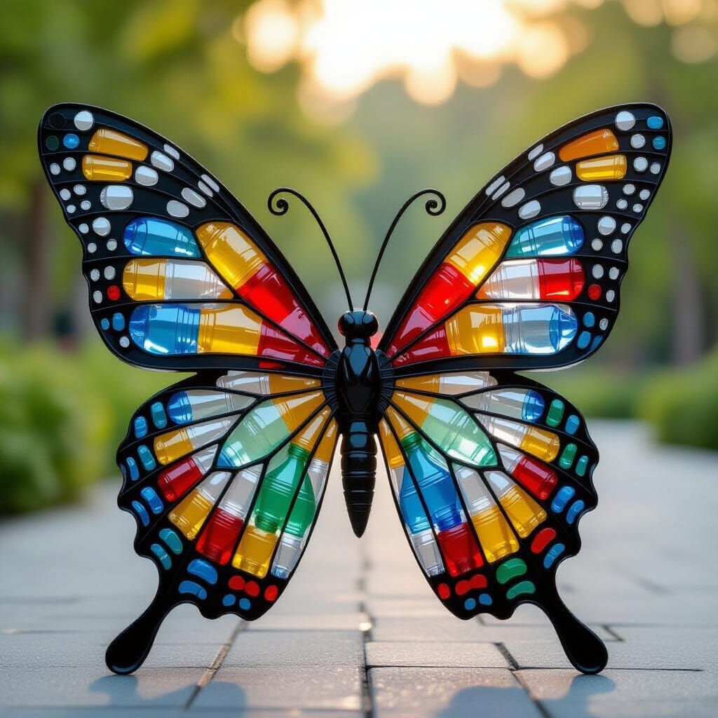 This image shows a butterfly sculpture with wings crafted from recycled plastic bottles. The bottle shapes are clearly visible in the design, highlighting the use of waste materials.