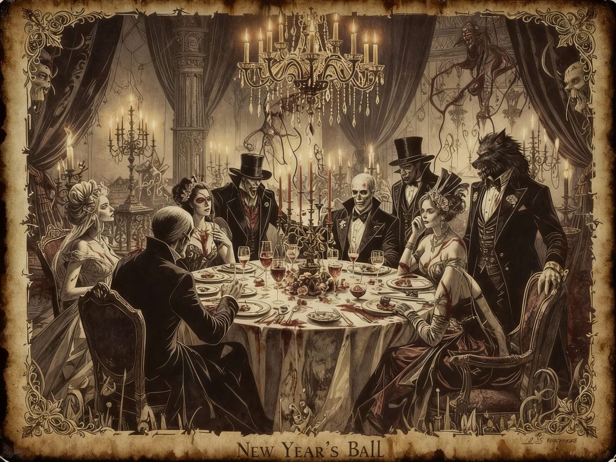 This image depicts a dark and decadent New Year's Eve masquerade party filled with supernatural creatures like vampires and werewolves, rendered in a dramatic, illustrative style.