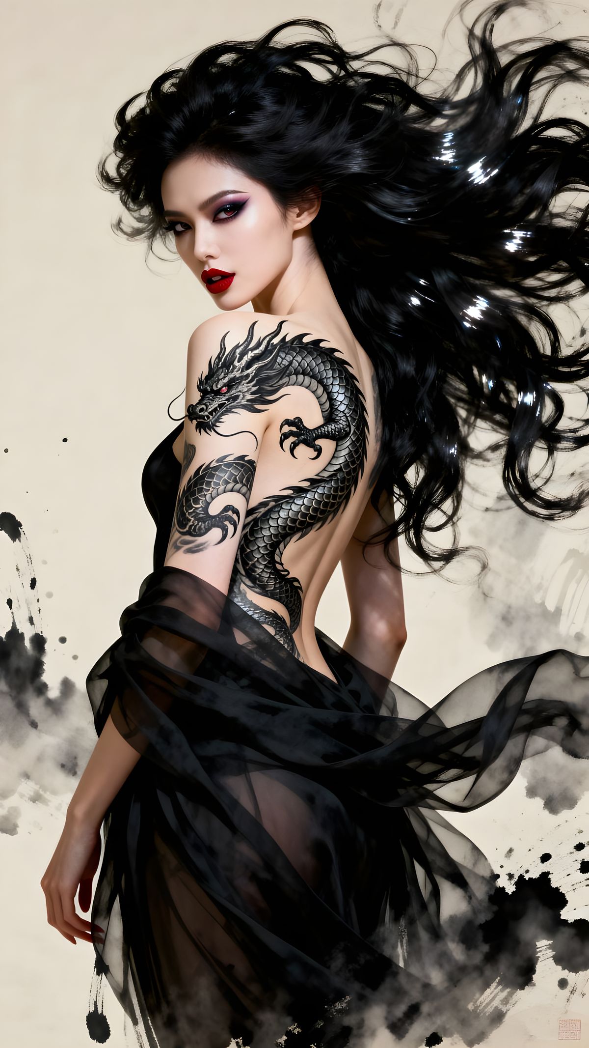 A hyperrealistic cinematic image of a captivating woman with rebellious allure, featuring flowing black hair and a detailed dragon tattoo. The tilt shift effect emphasizes her intense gaze.