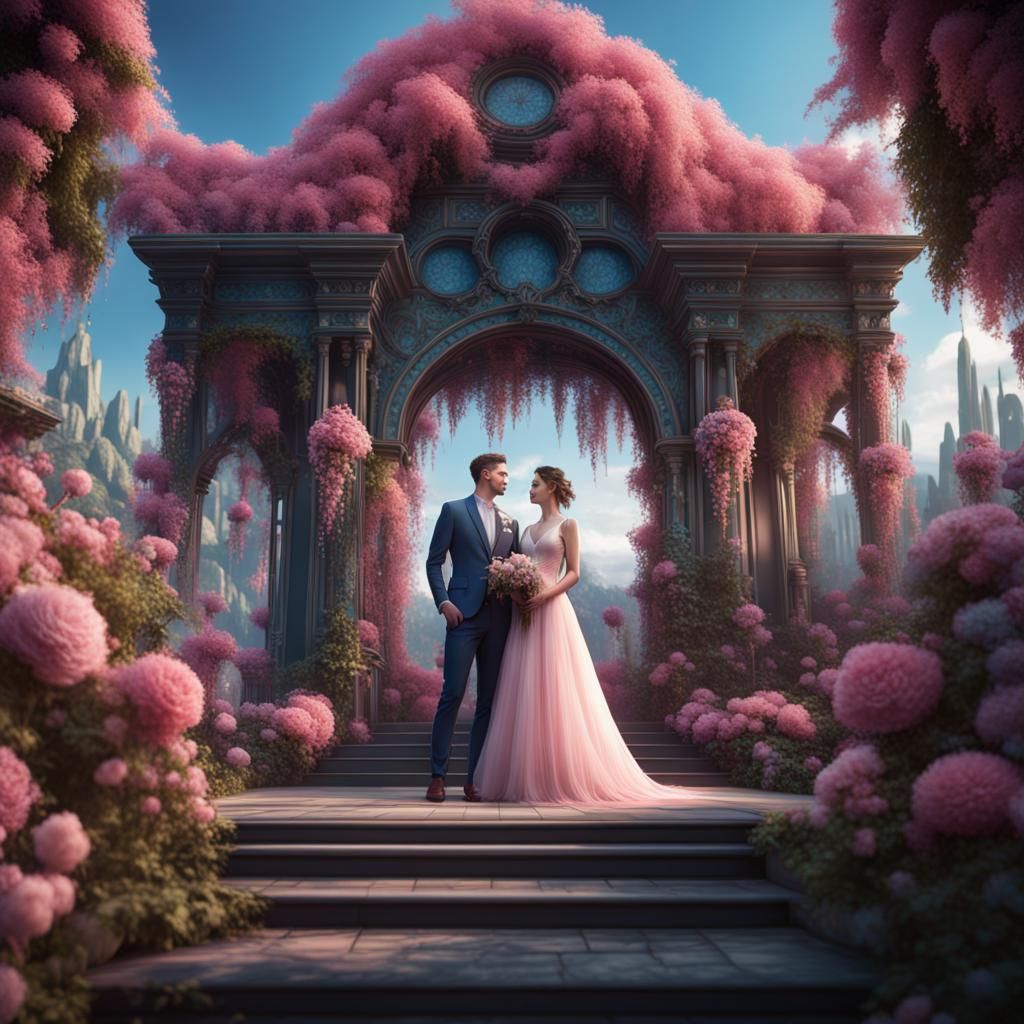 A detailed matte painting of a June wedding in pink and blue. The image features deep colors, intricate details, and a fantastical aesthetic, reminiscent of fantasy concept art.