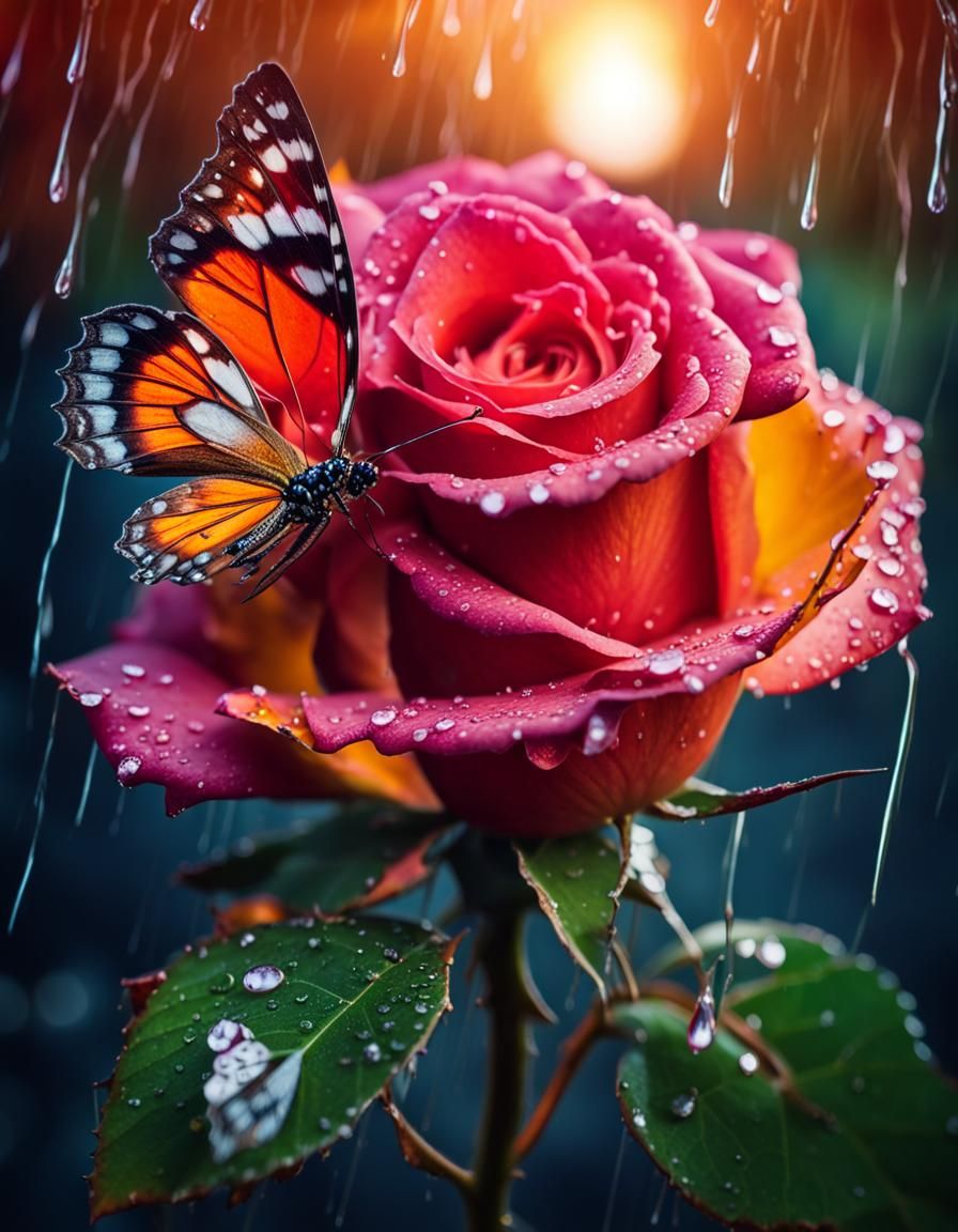A close-up photograph of a butterfly perched on a rose after a rain shower. The image features vibrant colors, glowing light, and reflective surfaces, creating a magical atmosphere.