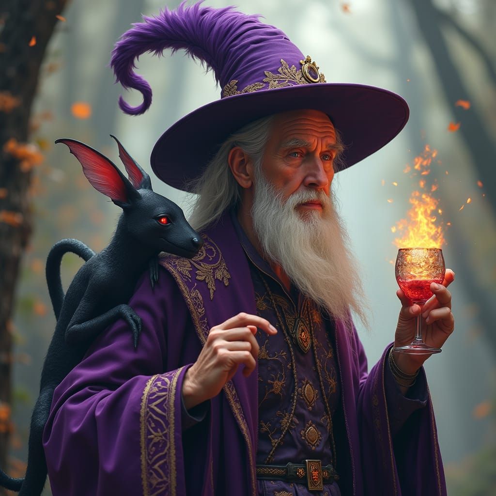 This image shows a mystic, elderly man with a purple hat and feathered clothing, wreathed in flames, holding a wine glass. He is accompanied by a shadow walker pet, defeating alien sentries in a dark fantasy, sci-fi style.