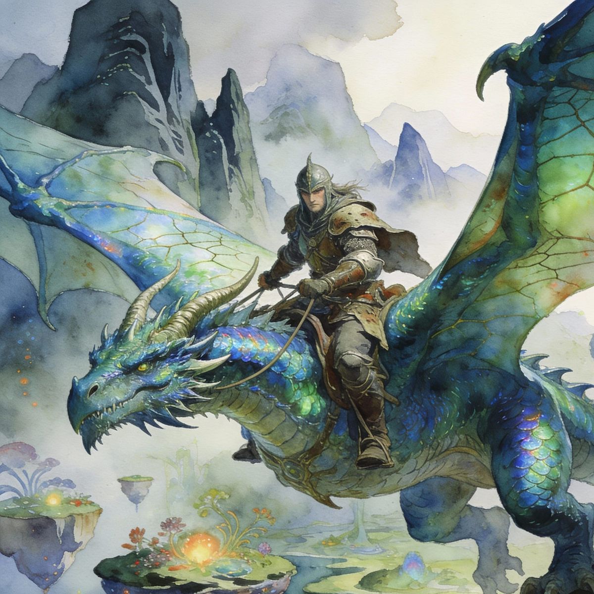 A warrior riding a dragon. The dragon filling the whole picture. Background: Mountains, a fantasy landscape. A watercolor painting in the style of Alan Lee, John Howe and Milo Manara.
