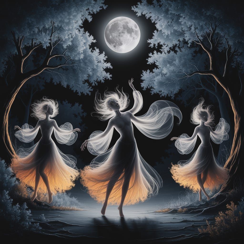 This enchanting image depicts a mystical forest bathed in the silvery light of a full moon, with wispy spirits dancing among the ancient trees. Soft, warm hues of amber and gold add a captivating warmth to the cool tones of the night, creating a sense of mystique and wonder.