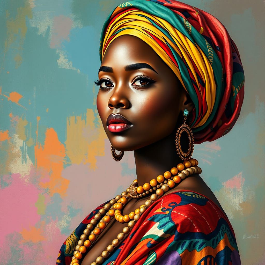 This image shows an African woman in traditional clothing, portrayed in a vibrant head and shoulders portrait. The artwork blends gouache and watercolor techniques in a maximalist style with impasto layers.