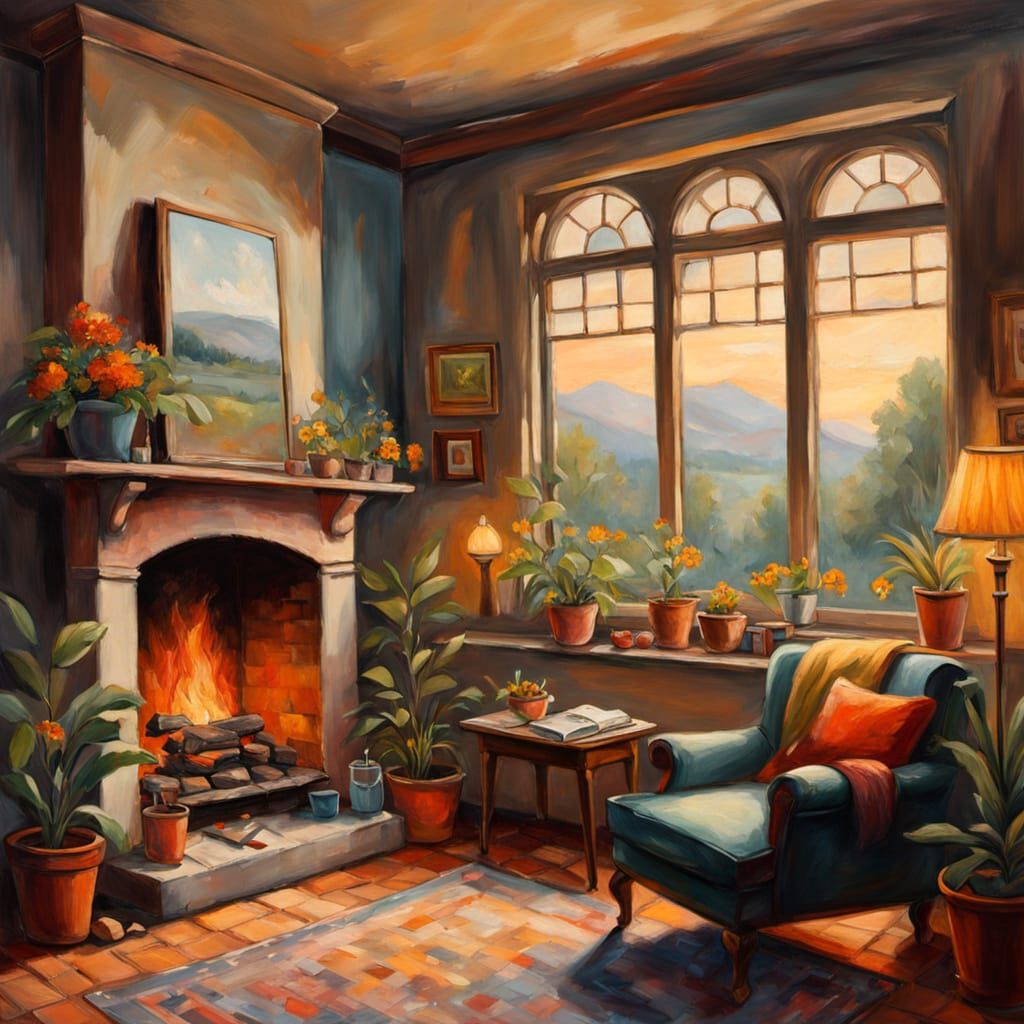 A child paints an airplane in a warm, inviting artist's workshop inside a brick house. The scene features an easel, plants, and a fireplace, rendered in a dreamlike, impressionistic style with muted earth tones.