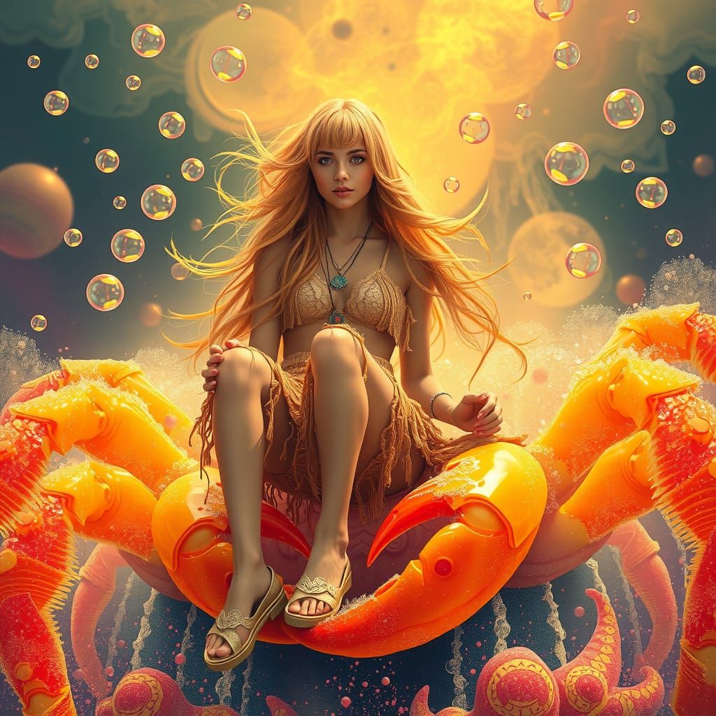A striking picture of a young woman with golden hair sitting on a giant gummy crab. The scene is set in a fizzy sea with warm, vibrant colors and a neon futurism aesthetic.