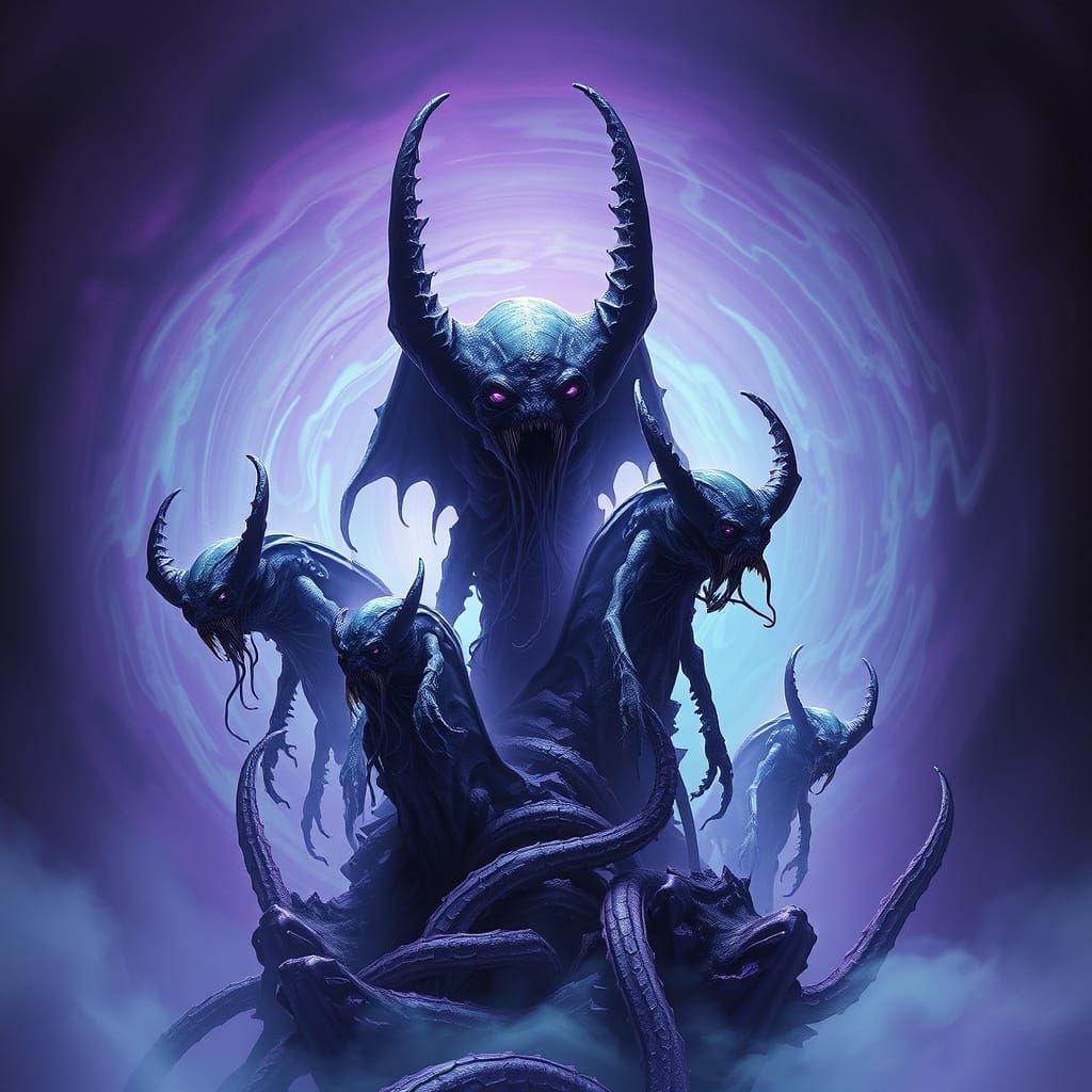 This image shows eerie, otherworldly creatures emerging from a swirling, purple-green nebula, with an eerie, atmospheric glow, blending dark surrealism and neon-lit futurism