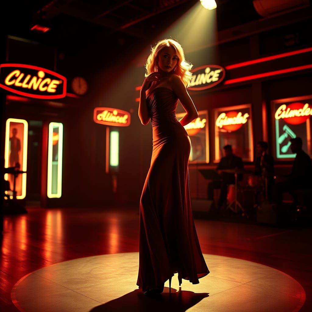 A striking picture of a blonde cabaret dancer on a dimly lit stage. The scene, reminiscent of film noir, features dramatic lighting, long shadows, and blurred silhouettes in a vivid color gradient.