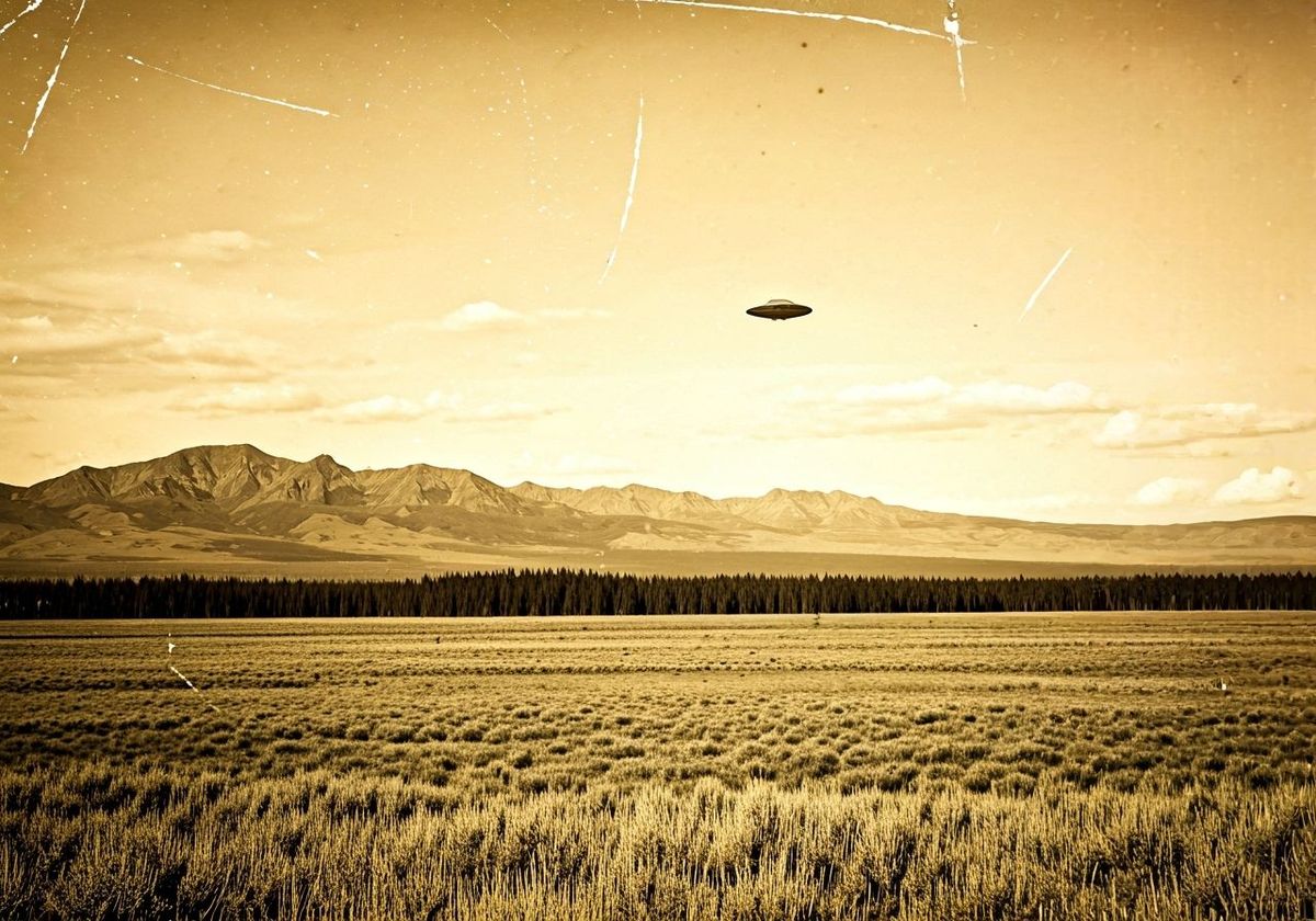 This image shows a faded vintage photograph of Yellowstone National Park in the 1930s. A small UFO is visible in the distance, adding a surreal element to the grainy, damaged print.