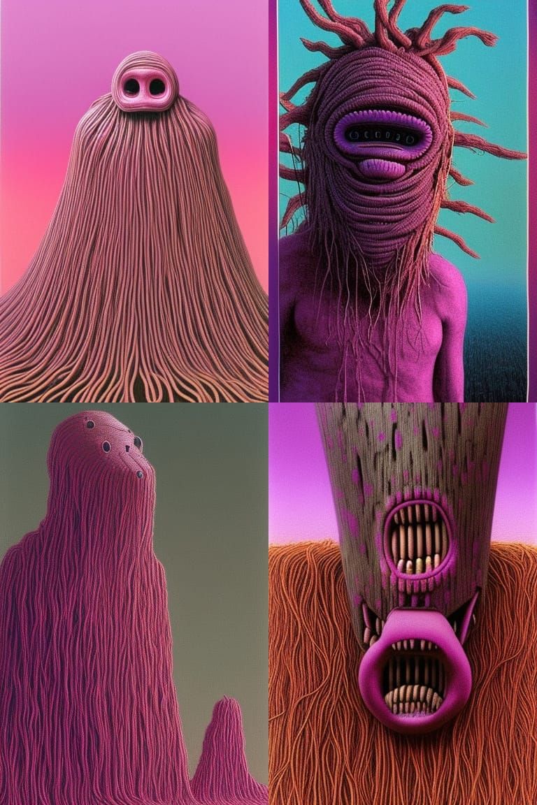 This image shows a bizarre pink and purple creature adorned with a grotesque mask of spaghetti. The artwork evokes a dark, surrealist style reminiscent of unsettling, dystopian art.