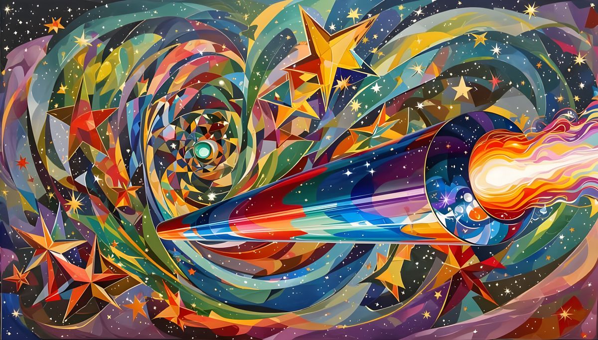 This image shows a metallic cylinder expelling vibrant plasma into a cosmos filled with swirling stars and colors. The artwork is rendered as an impasto oil painting with rich textures and unbounded motion.