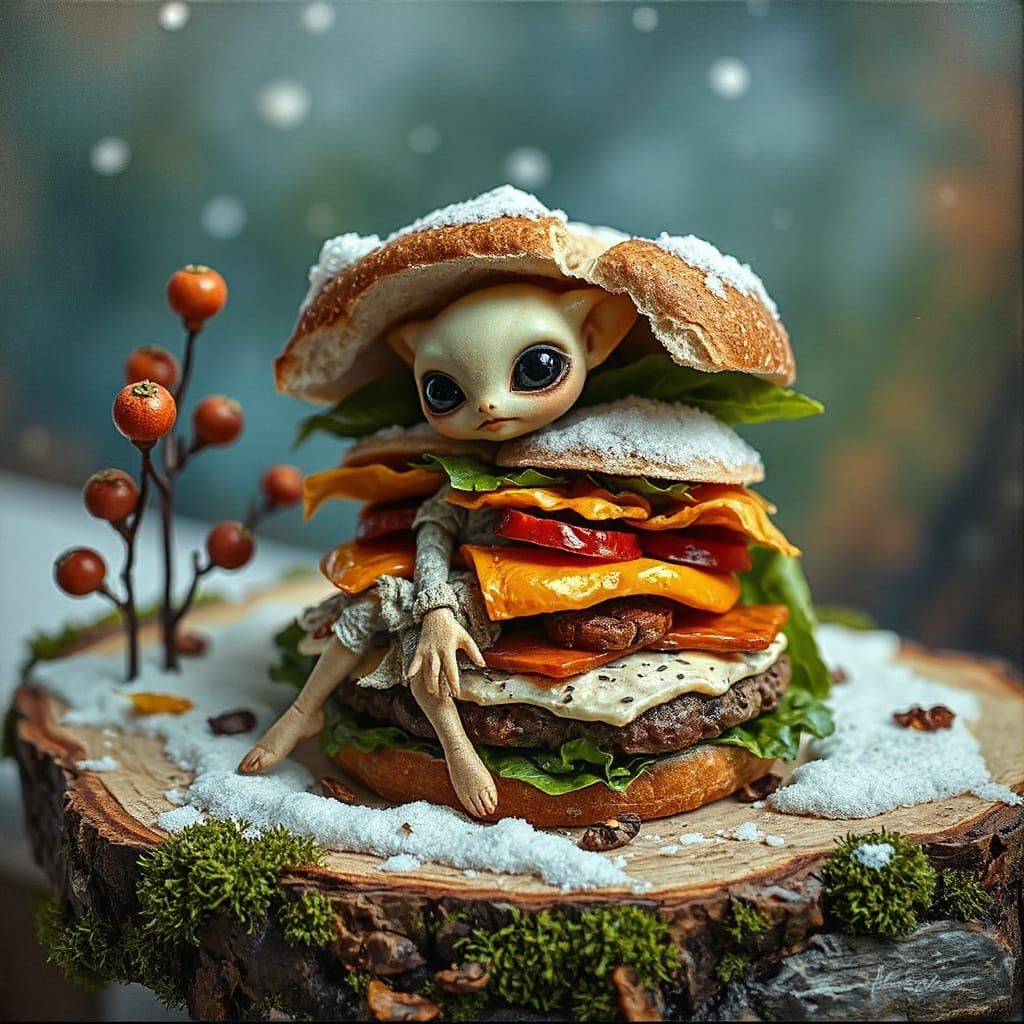 This detailed miniature showcases a fantasy sandwich with layers representing seasons. A humanoid alien in 18th-century attire is featured, depicted in a thick, textured impasto acrylic painting style.