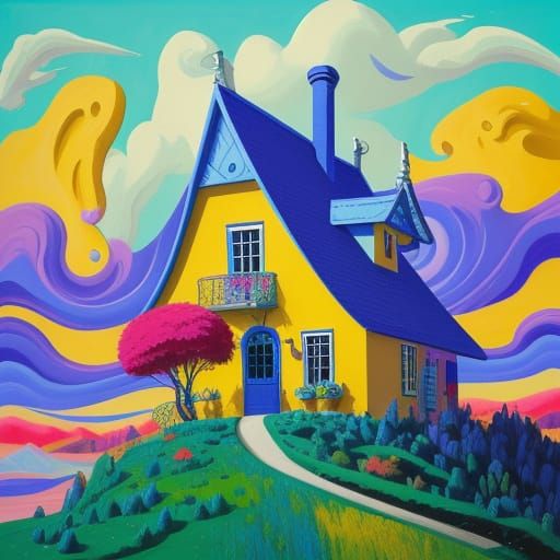 This image showcases a vibrant Fauvist house with bold colors and irregular shapes, set in a dreamlike landscape. Rendered as a detailed oil painting with textured brushstrokes.