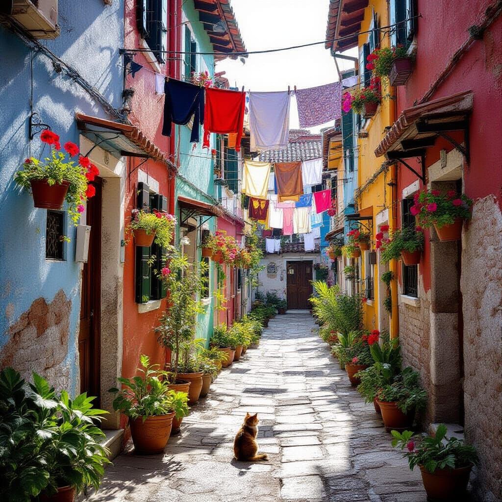 This image captures a narrow, vibrant alley in an old town, featuring colorful walls, potted plants, and laundry overhead. A relaxed cat enjoys the sunshine in this picturesque scene.