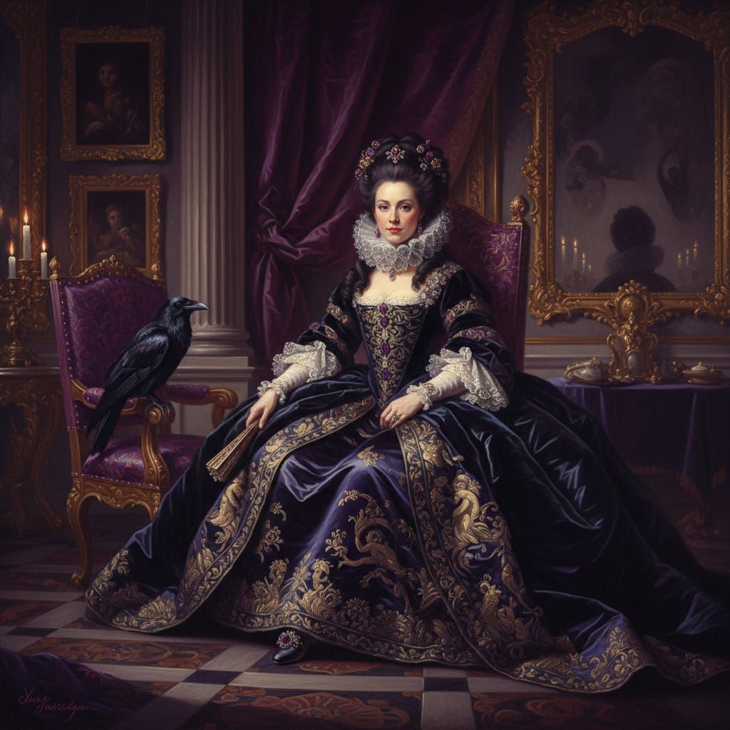 This image features an enigmatic noblewoman in a lavish Baroque portrait. She is seated in a grand, candlelit interior, richly adorned in velvet and silk, with dramatic chiaroscuro lighting.