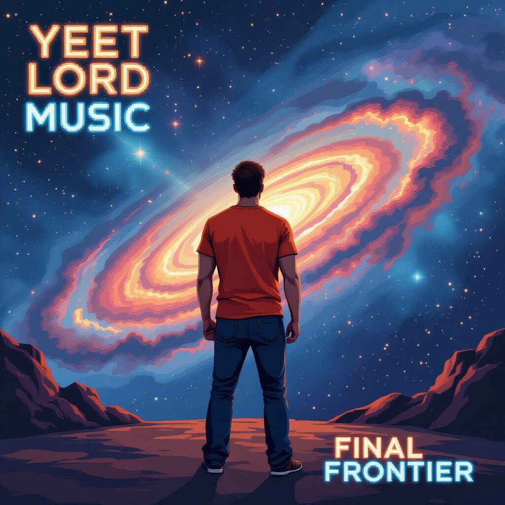 A digital painting of a man in an orange shirt facing a vast, swirling interstellar landscape. Features retro-futuristic art with bold colors and cosmic wonder, reminiscent of classic sci-fi covers.