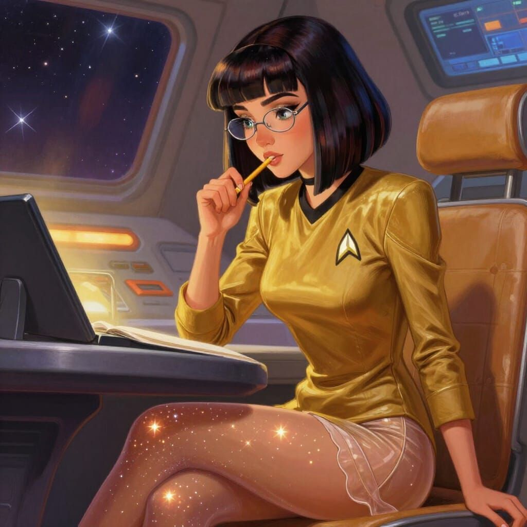 A striking digital painting of a nerdy woman with Cleopatra-style hair and glasses, wearing a Starfleet uniform and negligee. Her hose shimmer with sparkles, illuminated by dramatic lighting.