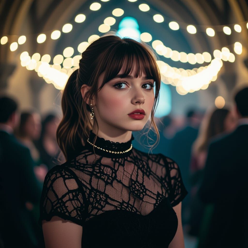 This image shows a young woman at a festive Hogwarts party. She is wearing a lace dress and choker, seemingly lost in thought. The scene is lit with twinkling lights in a cinematic style reminiscent of film.