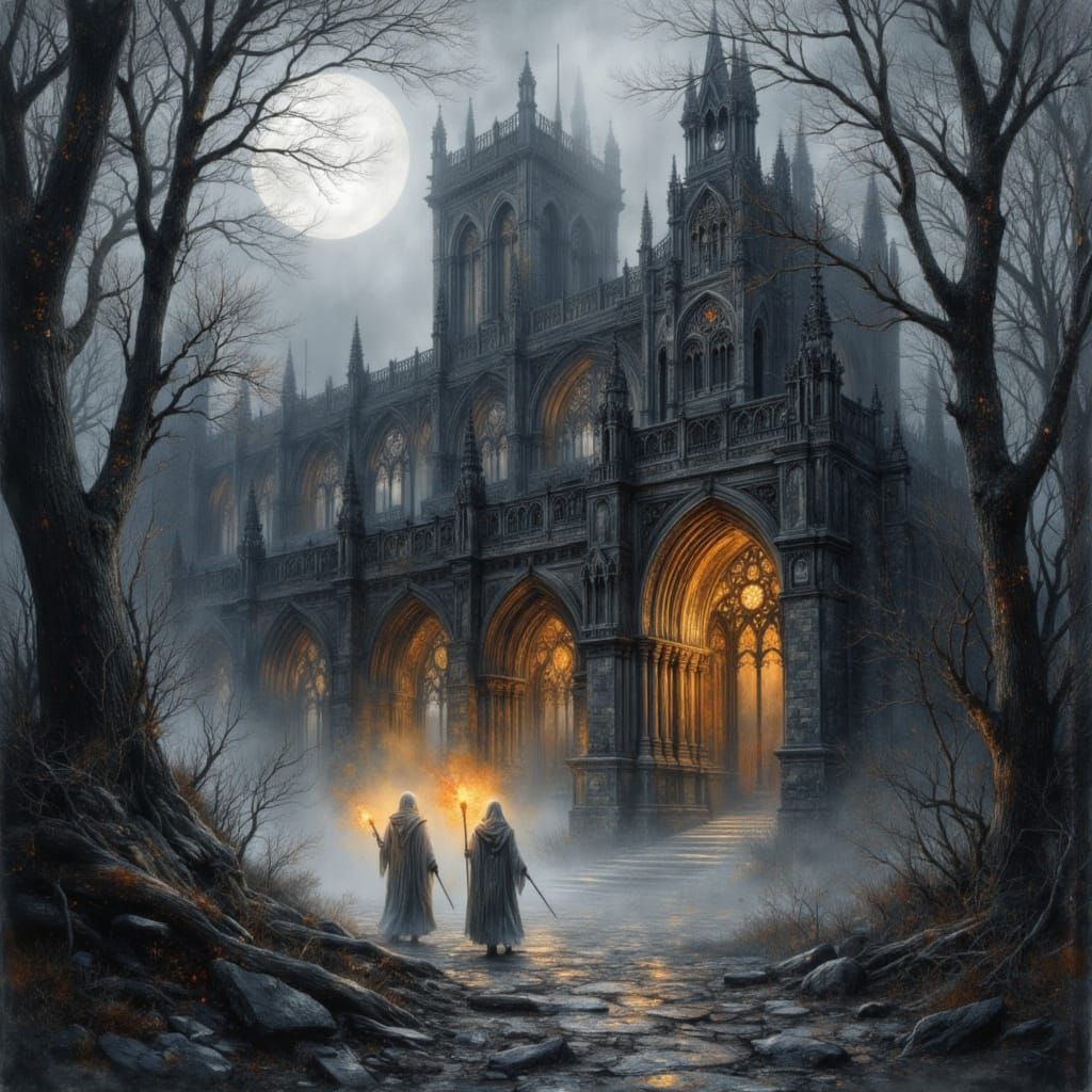 A haunting image of Gothic cathedral ruins in a misty forest, lit by moonlight. Monks with torches approach the ruins in this hyperdetailed charcoal drawing with volumetric lighting and deep colors.