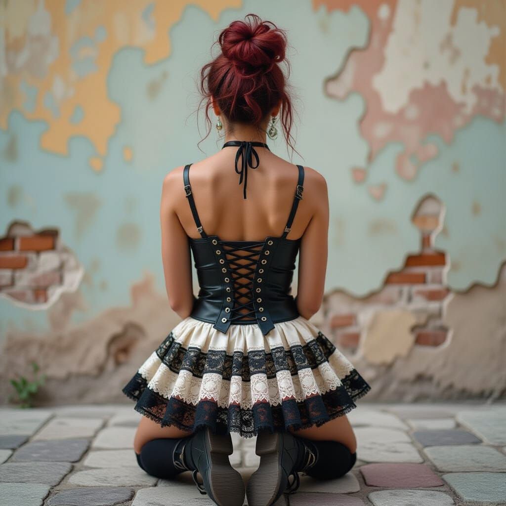 This image shows a young punk woman in a lace kilt kneeling and photographed from behind. The scene is infused with a rasquache aesthetic and vibrant colors, reminiscent of Tumblr's eclectic style.