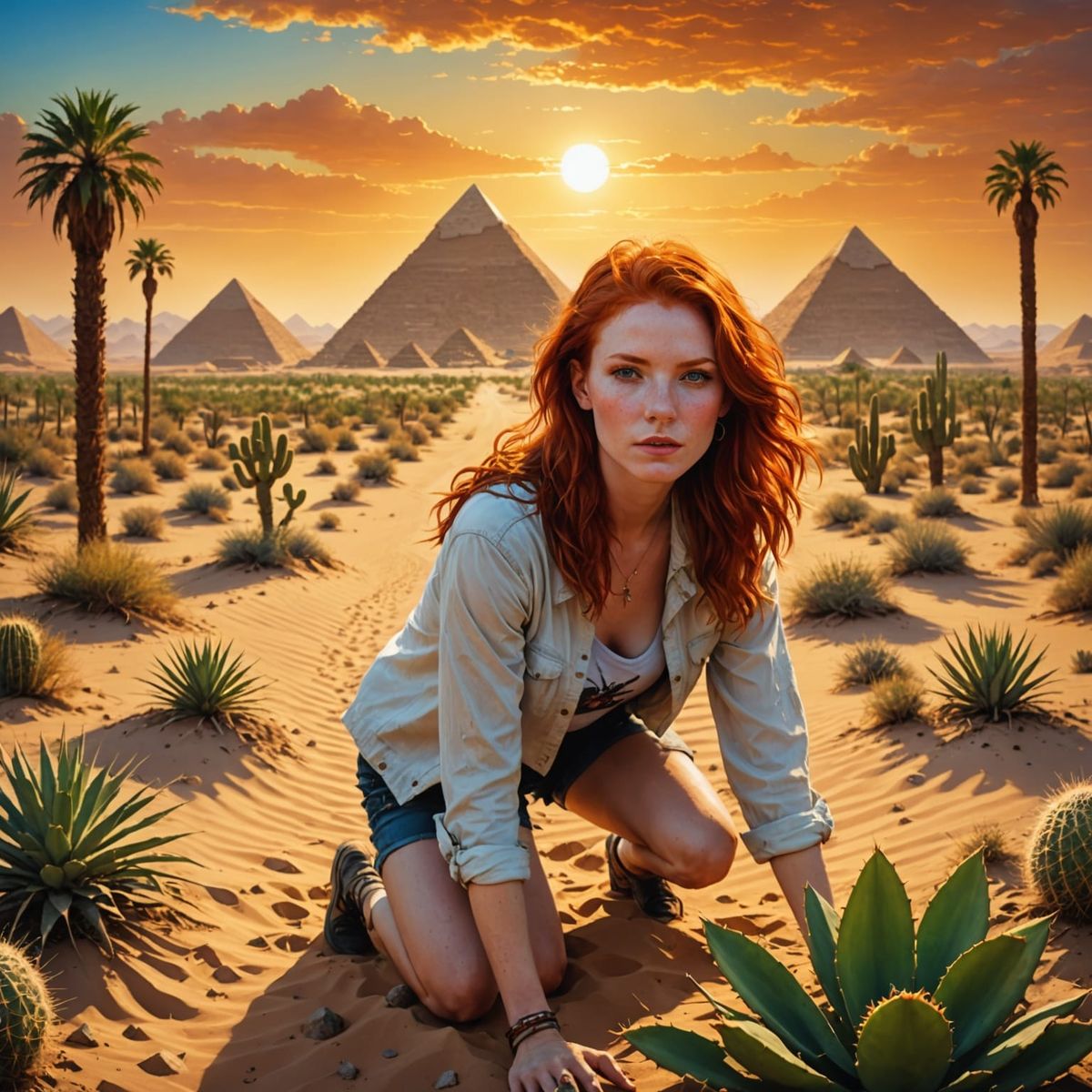 This realistic image depicts a redhead exploring a desert oasis with palm trees and a water pond, featuring uniquely colored Egyptian pyramids under a vibrant sunset sky.