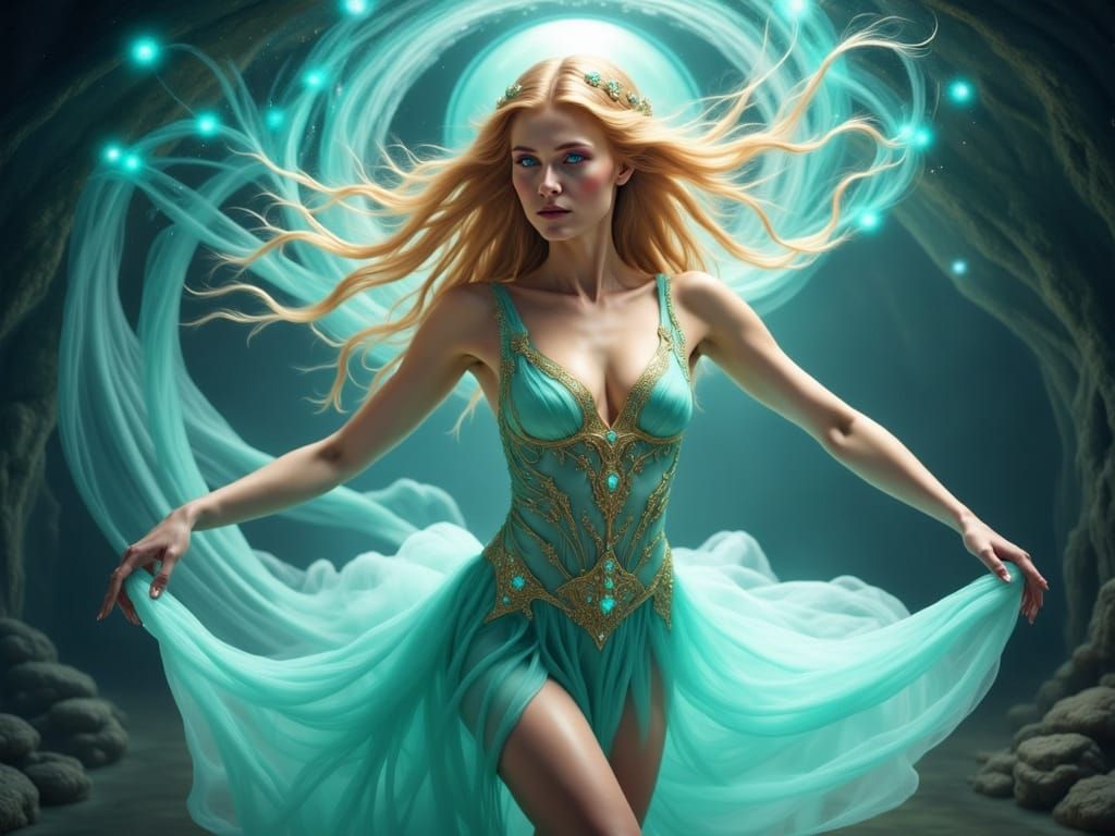 A captivating full-body image of a water goddess dancing amidst a watery vortex. She is adorned with gold trim, jewels and flowing silks, all in soft aqua tones.