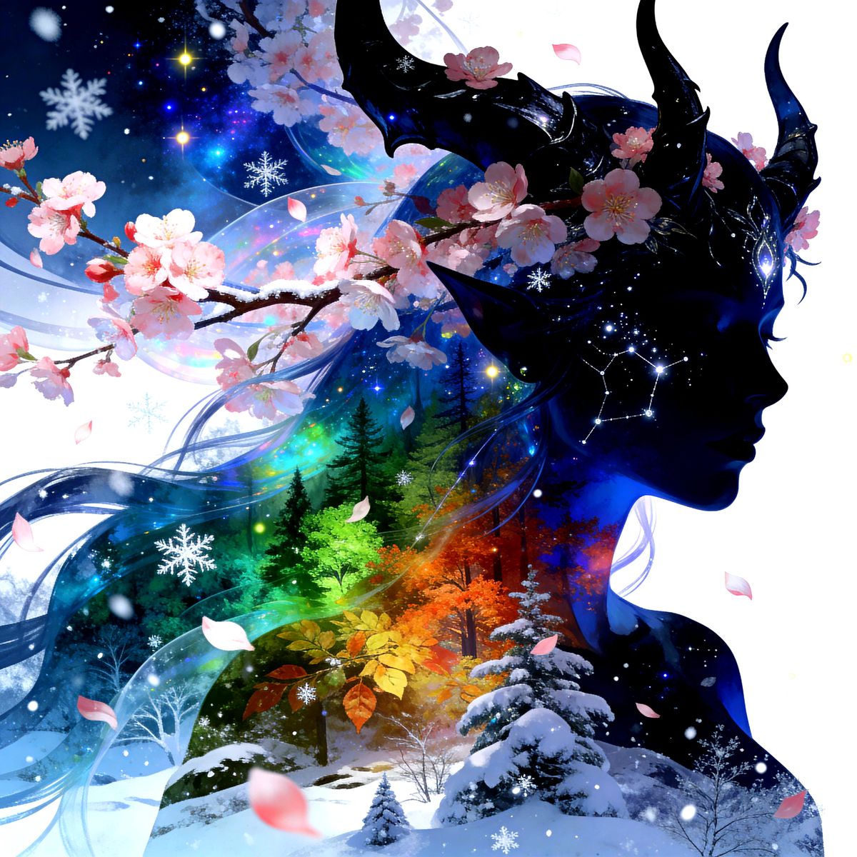 This digital illustration features a tiefling figure whose silhouette blends into an enchanted forest, showcasing the cycle of seasons. Celestial details and flowing elements create a surreal, cosmic scene.