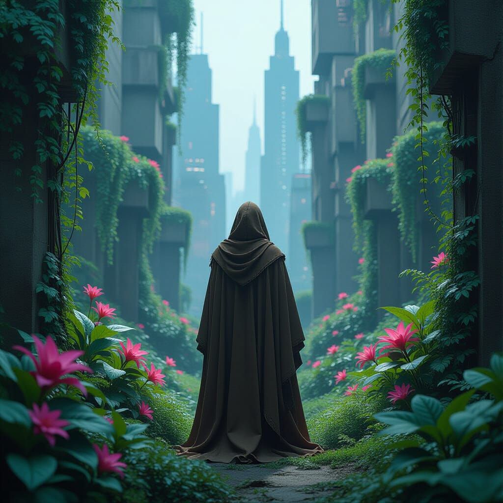 This image shows a cloaked figure in a lush garden reclaimed by nature in a futuristic city, with bioluminescent plants and overgrown skyscrapers. The scene blends industrial futurism with a neon-lit cyberpunk aesthetic.