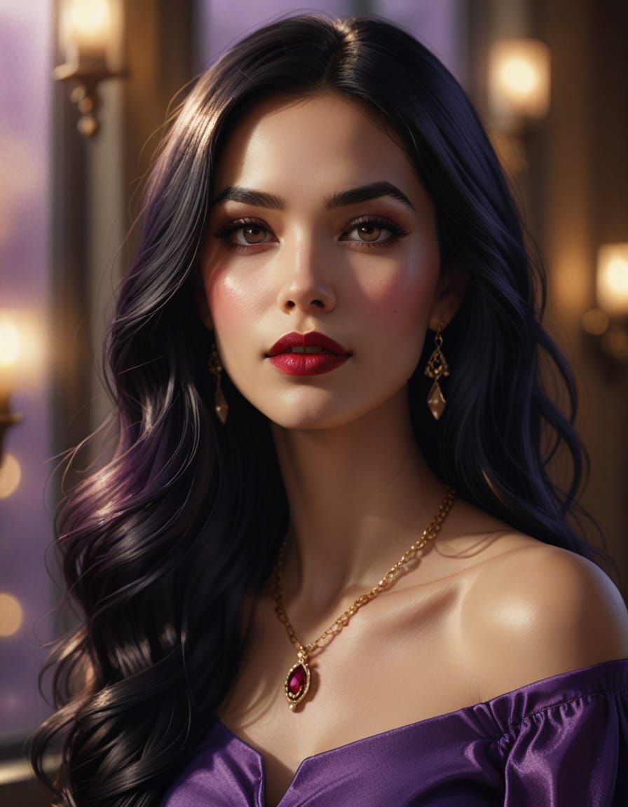 This image shows a close-up digital illustration of a woman with long black hair and fair skin. She wears a purple top and necklace, illuminated by a warm golden glow in soft focus.