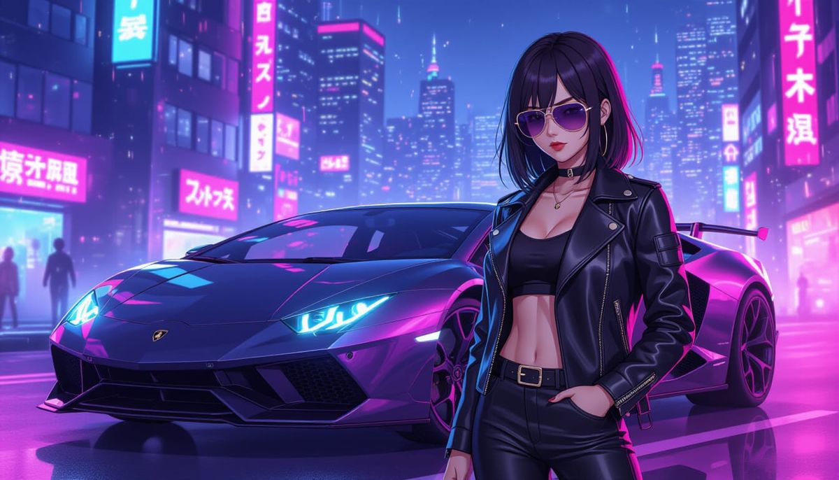 This image shows an anime-style girl in a leather jacket posing with a Lamborghini against a neon-lit cityscape background. The illustration has bold lines and vibrant colors in a futuristic aesthetic.